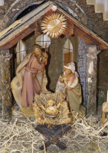 So zog auch Josef von der Stadt Nazareth in Galiläa hinauf nach Judäa in die Stadt Davids, die Betlehem heißt; denn er war aus dem Haus und Geschlecht Davids. Er wollte sich eintragen lassen mit Maria, seiner Verlobten, die ein Kind erwartete. Als sie dort waren, kam für Maria die Zeit ihrer Niederkunft, und sie gebar ihren Sohn, den Erstgeborenen. Sie wickelte ihn in Windeln und legte ihn in eine Krippe, weil in der Herberge kein Platz für sie war.