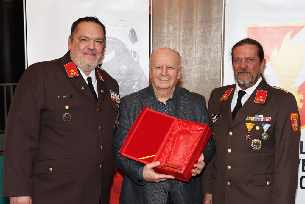 Auszeichnungsübergabe: Kommandant Sascha Drlo, Rupert Kornell, Kommandant-Stv. Peter Schmutz