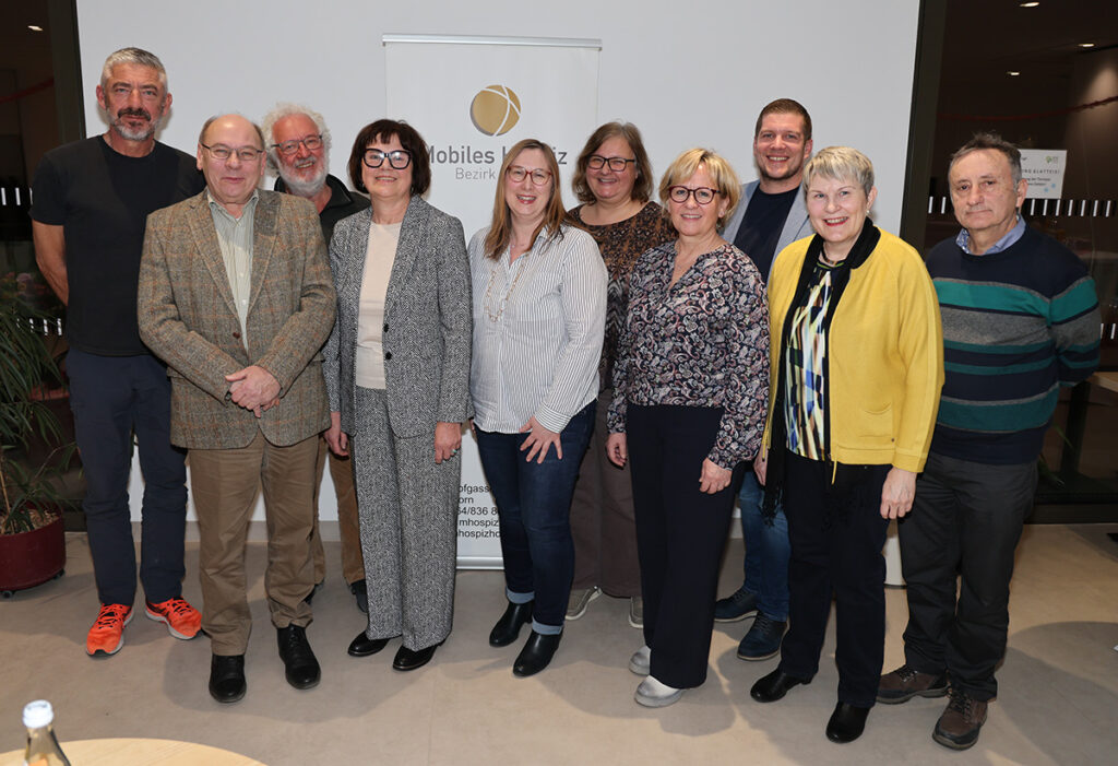 Der neue Vorstand – von links: Palliativ-Arzt Dietmar Weixler (Expertenteam), Obfrau-Stv. Karl Busta, Obfrau-Stv. Friedrich Eckhard, Obfrau Christine Zeiner, Kassier-Stv. Claudia Vogler-Zach, Schriftführer-Stv. Claudia Grötz, Petra Ableidinger (Expertenteam), Schriftführer StR  Marco Stepan, Gertraud Busta (Expertenteam) und Kassier Walter Schmied