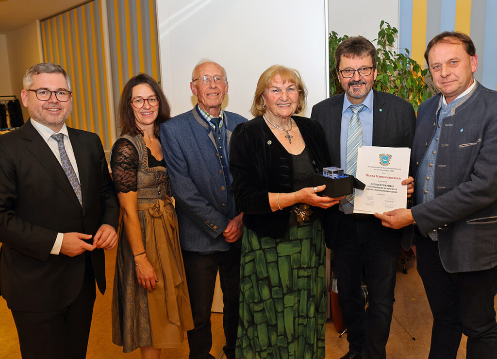 Bei der Preisverleihung: Landesrat Ludwig Schleritzko, StR Barbara Stark, StR a. D. Erich Schmudermayer, Herta Schmudermayer, Bgm. Gerhard Lentschig und GR Robert Lochner