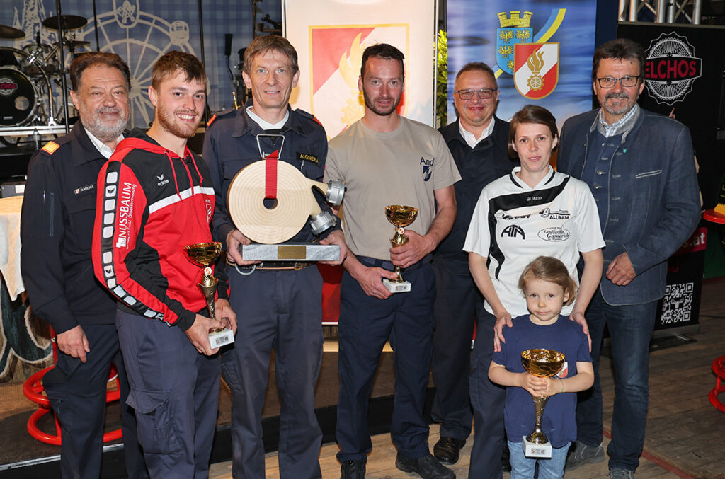 Am Bild vorne von links: Stefan Ederer (Poigen), Andreas Aigner (St. Marein), Andreas Toifl (Breiteneich) und Daniela Allram (St. Marein) mit ihrer Nora. Es gratulierten OBR Christian Angerer, Abschnittsfeuerwehrkommandant BR Klaus Ringl und Bgm. Gerhard Lentschig (hinten von links).