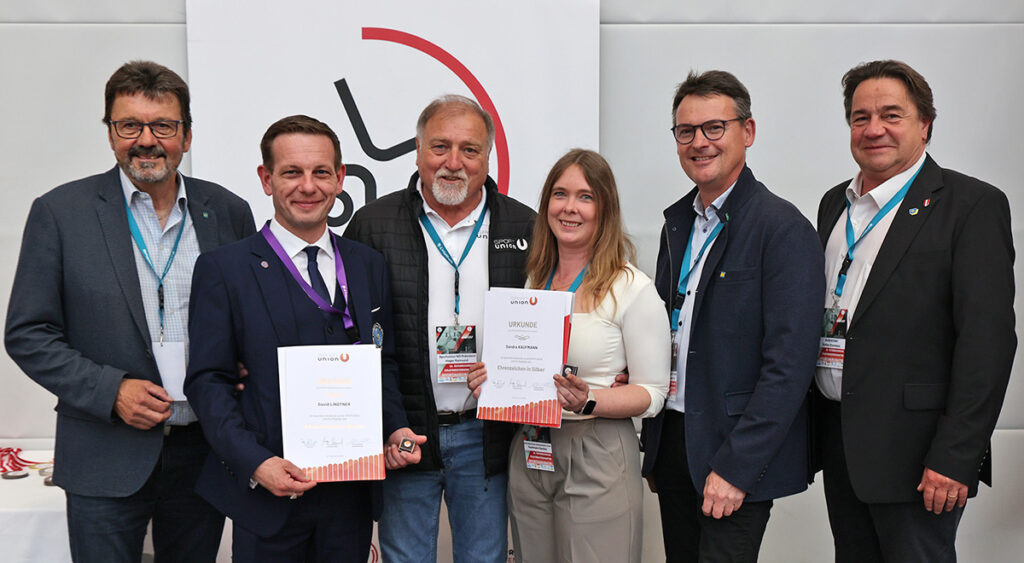 Die beiden Verantwortlichen für die Staatsmeisterschaft haben es sich redlich verdient: Wertungsrichter David Lindtner wurde von NÖ-Präsident Raimund Hager (3. v. li.) mit dem „Ehrenzeichen in Bronze“ der SPORTUNION Österreich ausgezeichnet, Trainerin und Sektionsleiterin Sandra Kaufmann mit „Ehrenzeichen in Silber“ – es gratulierten Horns Bürgermeister Gerhard Lentschig, LAbg. Franz Linsbauer und Bundesrat Klemens Kofler (v. li.).