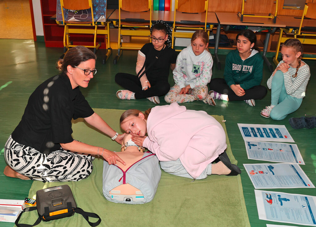 Hier im Bild zeigt Dr. Ulrike Kroat wie man „Erste Hilfe“ leisten kann.