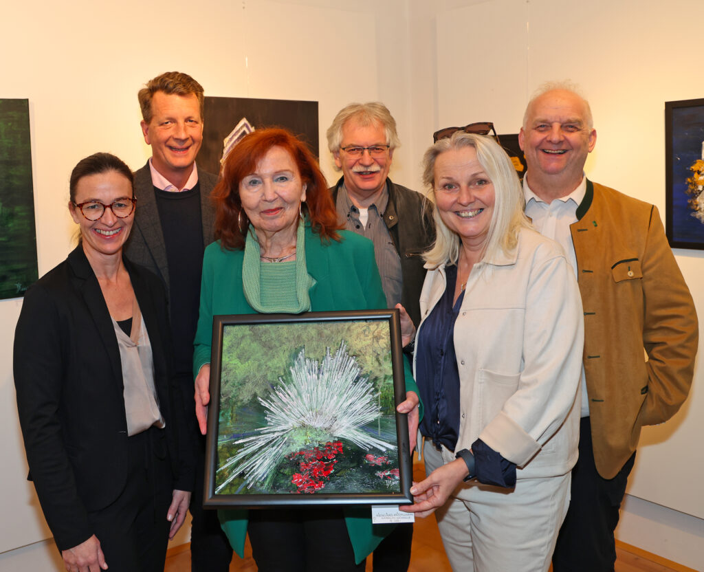 Gute Laune war bei der Eröffnung angesagt – vorne von links: Kulturstadträtin Barbara Stark, Ingrid Steininger mit dem Bild „Kieseliges Kristallhaar“, das binnen Minuten einen Käufer fand, und Stadträtin Maria van Dyck; hinten von links: Museumsvereinsobmann Gilbert Zinsler, Mineralien-Aussteller Albert Prayer und Museumsdirektor Anton Mück.