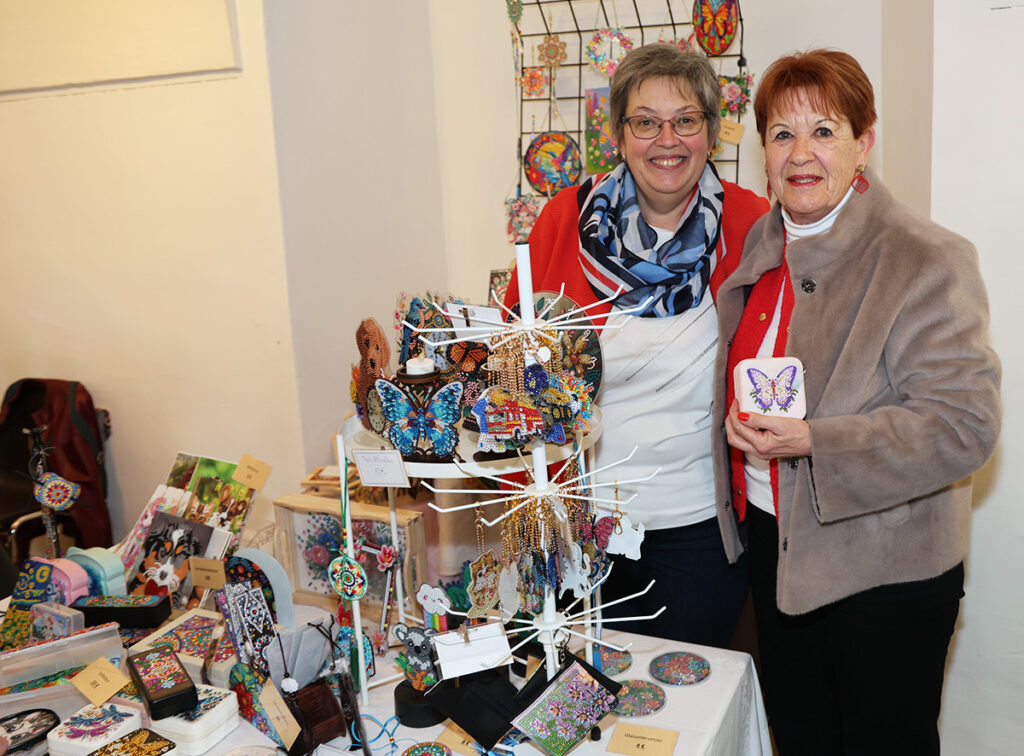 Eva Heilys (li.) „Diamond painting“-Kunstwerke gefielen Renate Haiden (re.) so gut, dass sie gleich einige Stücke erwarb.