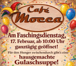 Das Café Mocca hat am Faschingsdienstag ab 10:00 Uhr geöffnet, den ganzen Tag über gibt es für den Hunger zwischendurch hausgemachte Gulaschsuppe.